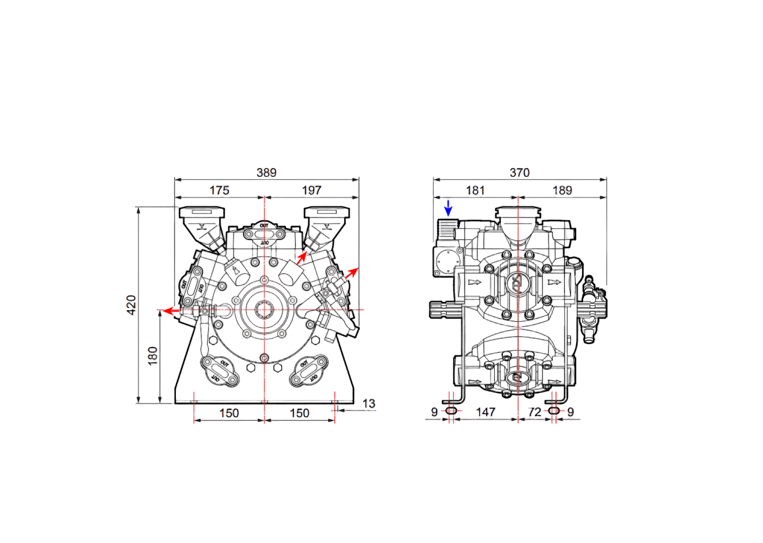 All pumps are supplied with appropriate hose connections, mounting base plates and 1-3/8” six splined male input & output through shafts.