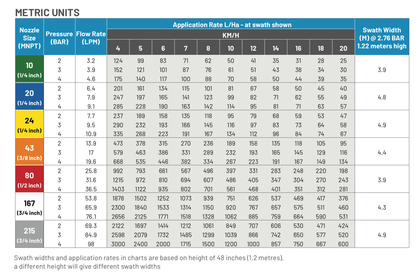 Note the nozzle rate chart swath width is per nozzle.