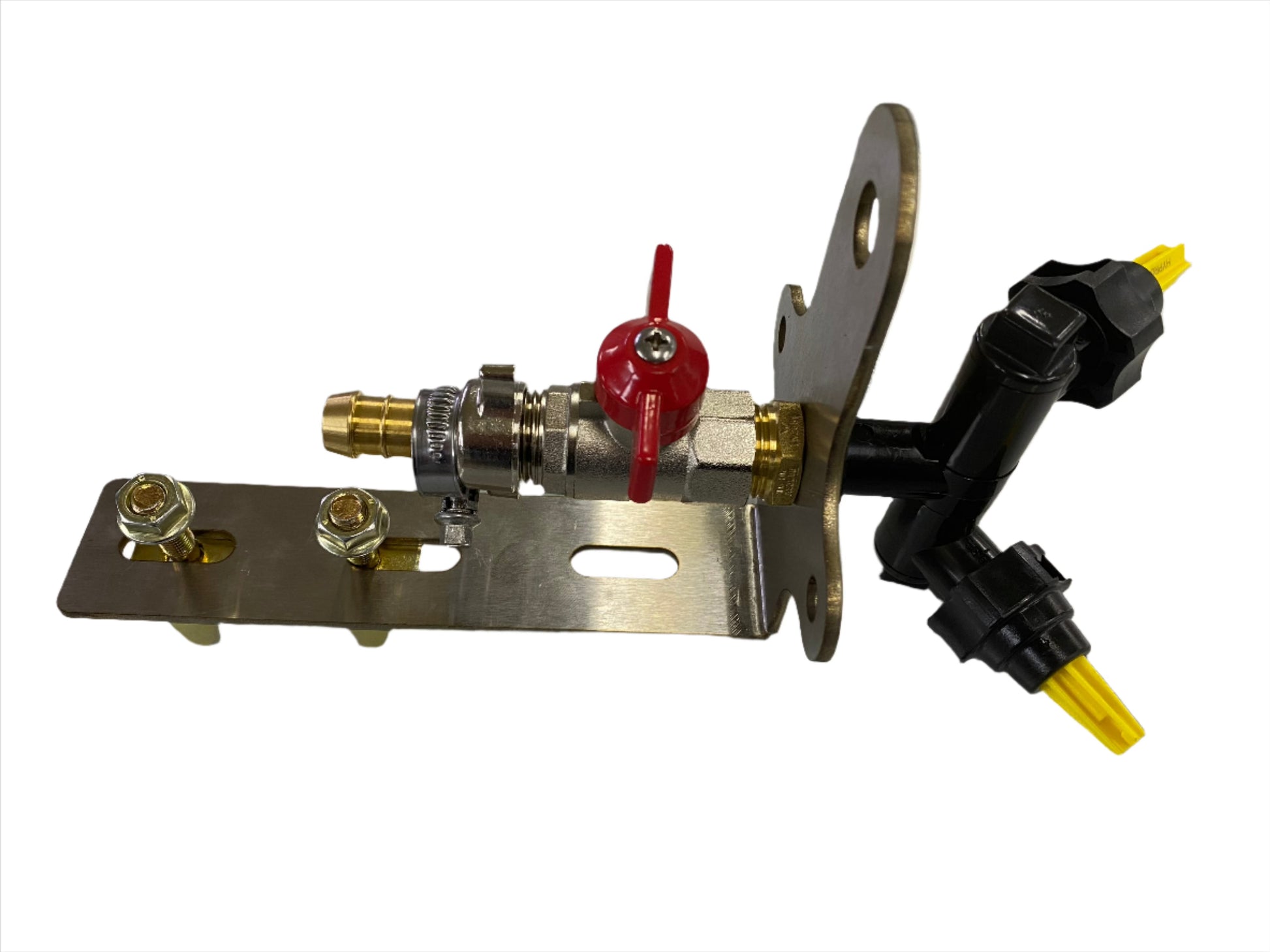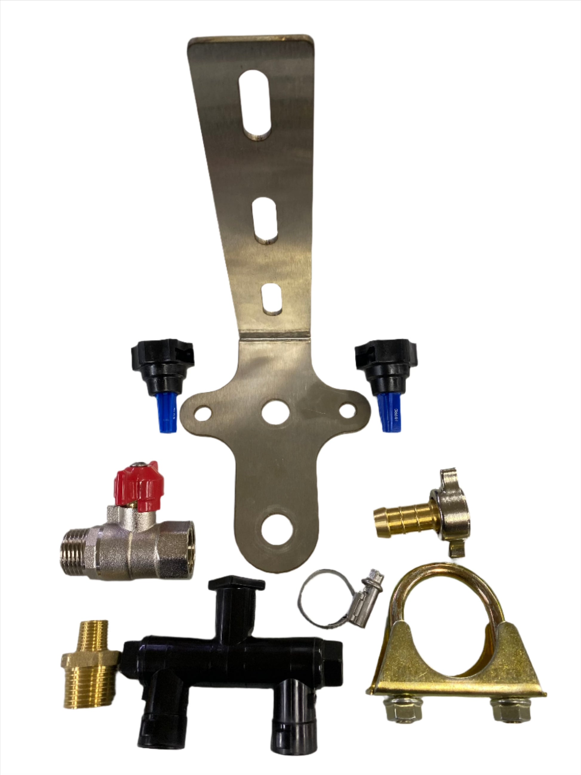 SS mounting bracket, mounting clamp, double swivel, 1/2 x 1/4 nipple, 1/2 tap, 1/2 (13mm) tail, hose clamp, X2 Hypro FC-XT Nozzles, X1 blanking cap for single nozzle use.